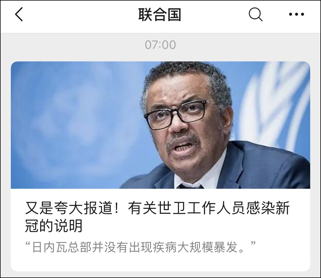 美媒稱世衞組織65人感染新冠 聯合國全球傳播部:誇大報道