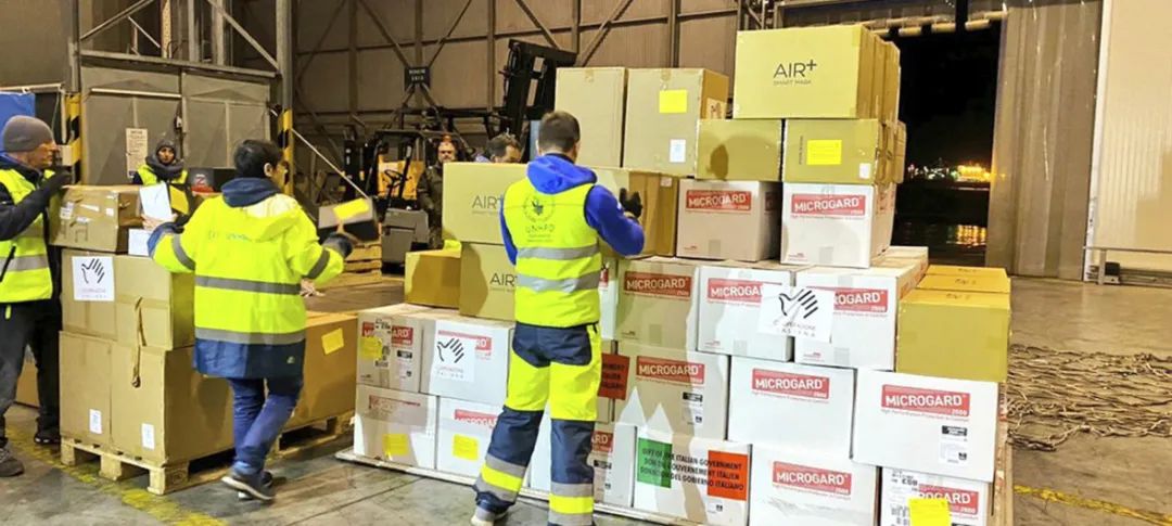 ©️ 世界糧食計劃署圖片|在意大利募集的用於抗擊2019冠狀病毒的醫療物品已準備好運往中國。