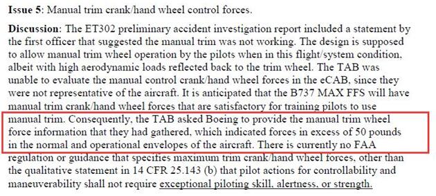 TAB專家組:我們認為,需要不少於50磅的力來搖動配平手輪沒有違反當前規定