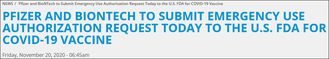 【文/觀察者網 熊超然】當地時間11月20日,美國製藥企業輝瑞公司(Pfizer)在其官網宣佈,該公司已正式向美國食品藥品管理局(FDA)提交了新冠疫苗的緊急使用授權申請。