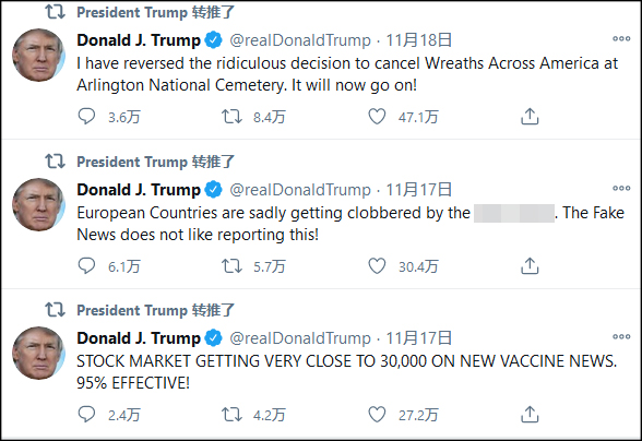 得益於這種處理方式,作為現任美國總統的特朗普才能不停地發表爭議言論卻不被推特刪帖、封號,這些“越界言論”最多隻會被貼上標籤或被摺疊。在大選失利後,特朗普天天都在推特上轉發或發表關於“選舉欺詐”的內容,而這些基本都被貼上了“爭議內容”的標籤。