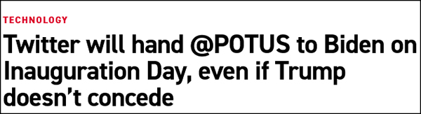 然而不管特朗普是怎麼打算的,他愛不釋手的推特已經表明了立場。推特官方證實,在拜登宣誓就職的當天,他們就會把用户名為“POTUS”的美國總統官方賬號移交給拜登,白宮、副總統、美國總統夫人的官方賬號也將一併移交給拜登陣營。