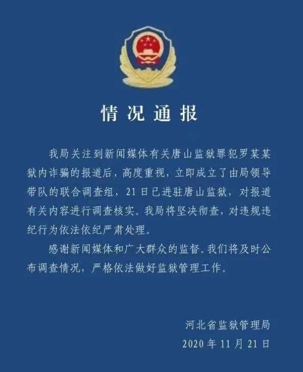 河北監獄管理局微信公號河北監獄11月21日消息稱,該局關注到有關唐山監獄罪犯羅某某獄內詐騙的報道後,立即成立了聯合調查組,21日已進駐唐山監獄。