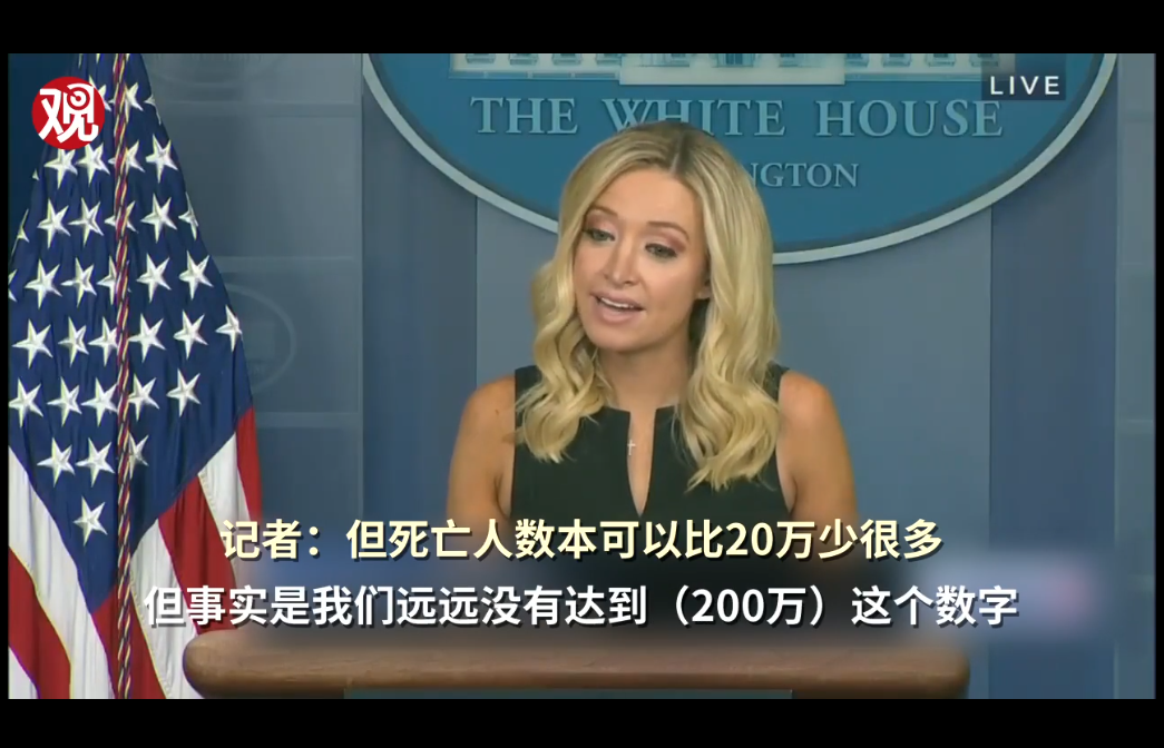 當地時間9月22日,當被質疑特朗普政府本可以挽救更多生命時,白宮發言人凱利·麥肯納尼表示死亡人數未到200萬這個“目標”(觀察者網視頻截圖)
