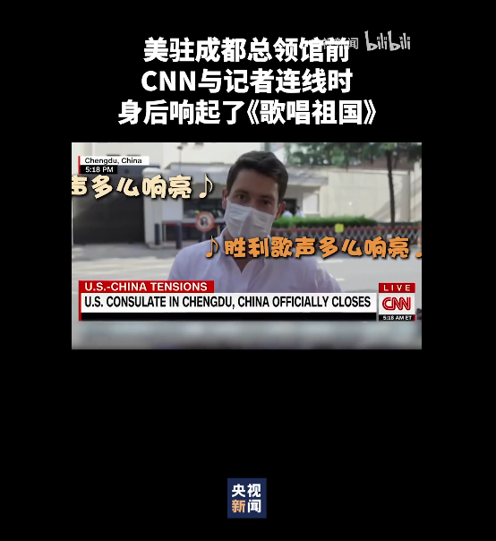 7月27日,美國駐成都總領事館閉館時,中國羣眾自發在其門口唱起愛國歌曲(央視新聞截圖)