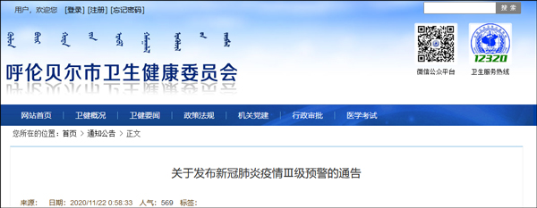 呼倫貝爾市衞生健康委員會網站11月22日消息,2020年11月21日,內蒙古自治區呼倫貝爾滿洲里市報告2例本土新冠肺炎確診病例,根據《呼倫貝爾市新型冠狀病毒肺炎疫情防控應急預案(2020年第二版)》(呼防指字〔2020〕102號)的要求,經研究決定,發佈新冠肺炎疫情防控Ⅲ級預警信息如下: