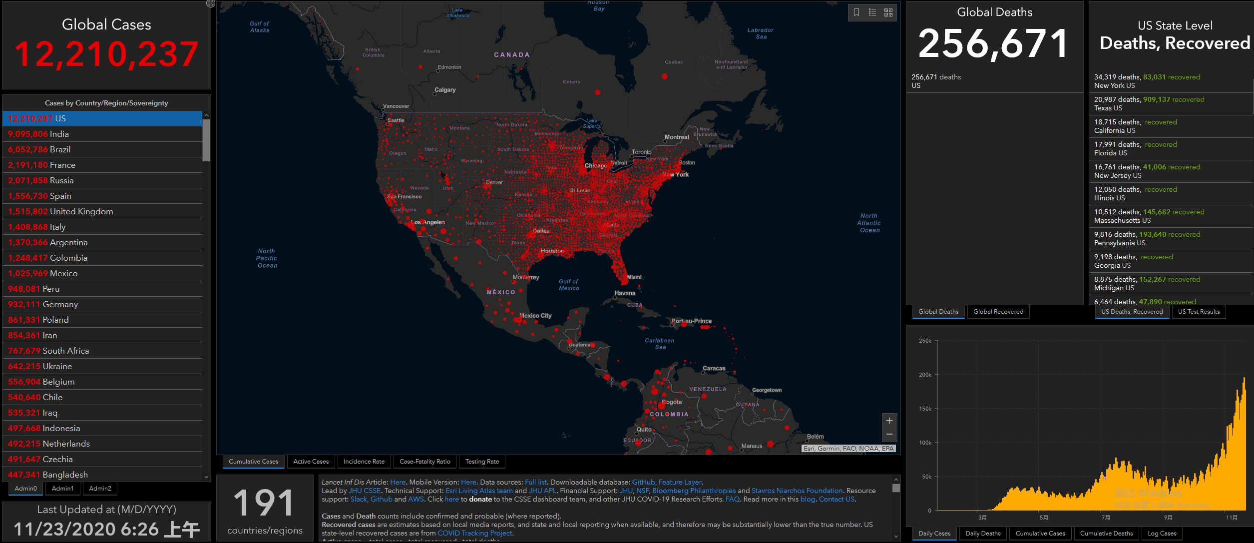 (觀察者網訊)根據美國約翰斯·霍普金斯大學實時數據,截至北京時間11月23日6時26分,美國累計新冠確診病例12210237例,累計死亡256671例。過去24小時,美國新增確診病例165303例,新增死亡病例1130例。