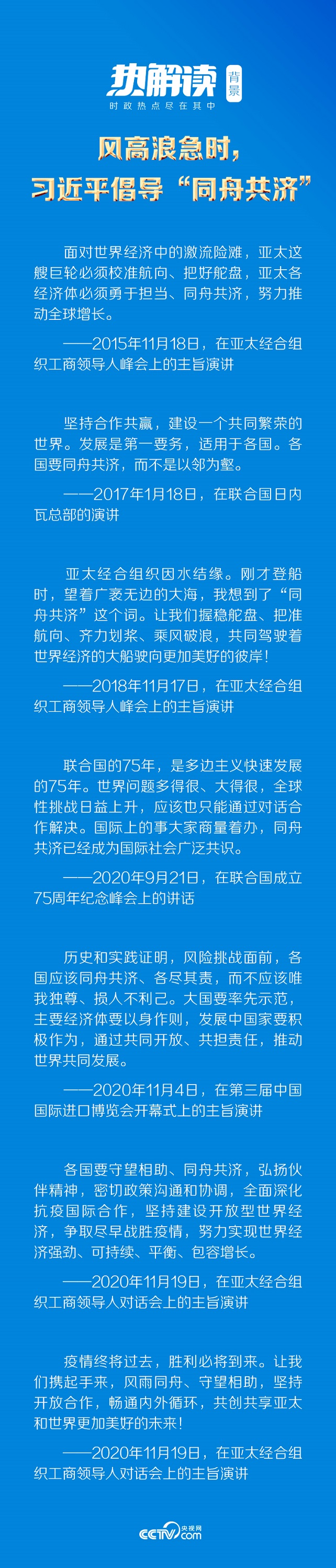 習近平主席在亞太經合組織工商領導人對話會上以“同舟共濟”作喻:“各國要守望相助、同舟共濟,弘揚夥伴精神,密切政策溝通和協調,全面深化抗疫國際合作,堅持建設開放型世界經濟,爭取儘早戰勝疫情,努力實現世界經濟強勁、可持續、平衡、包容增長。”