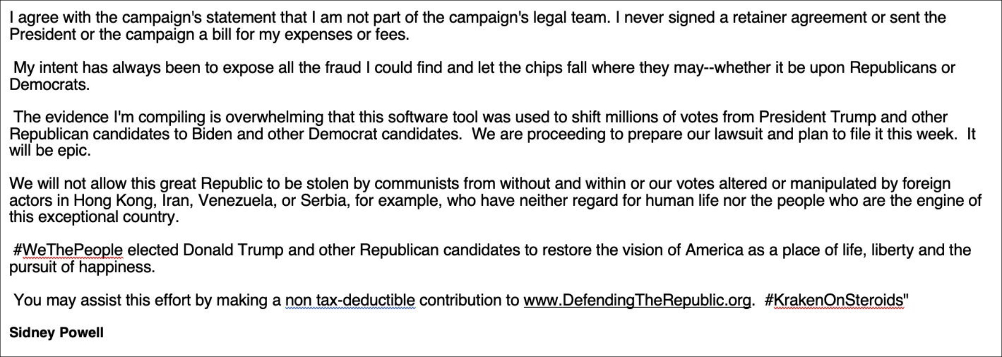 鮑威爾在回應時依然堅持有“壓倒性的證據”證明大選“欺詐” 圖自:社交媒體