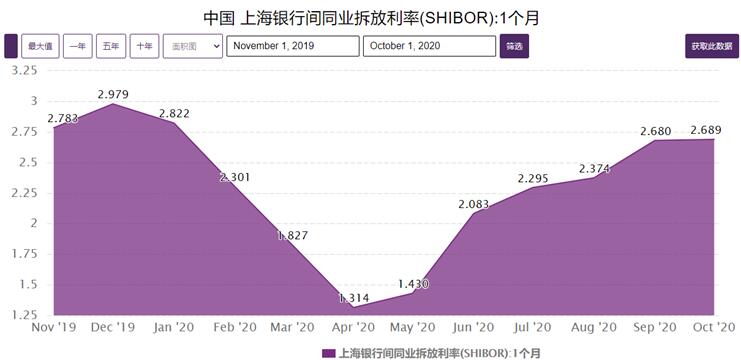 圖中很明顯,全國封城、抗疫最要緊的三四月份國內出台了非常寬鬆的貨幣政策,銀行大量放貸,支持企業渡過難關。因此銀行拆借利率也迅速下跌至谷底。但是隨着抗疫的成功和復工復產的進度,銀行拆借利率也慢慢回升。今天,銀行拆借利率已經接近疫情前的水平。資金成本比起3、4月份最低點已經上升了一倍。