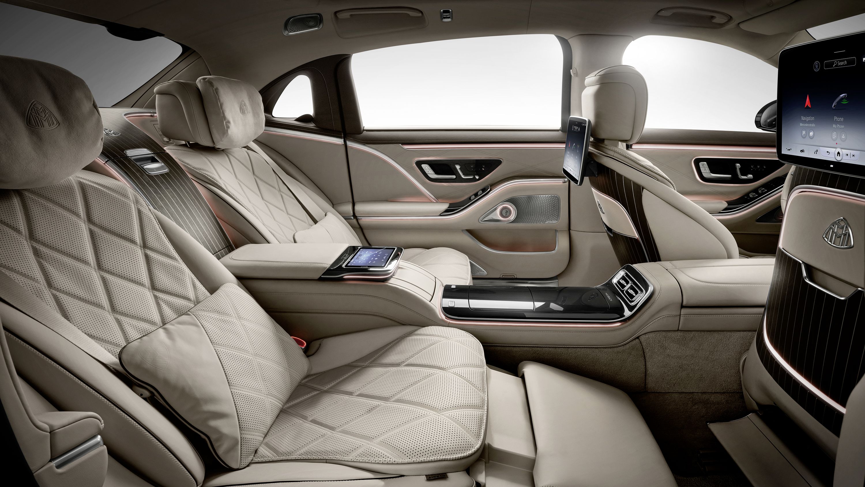 全新邁巴赫S級轎車擁有3396毫米的軸距,與全新S級轎車相比,增加的180毫米完全應用於後排。電動舒適後門可通過7種方式控制開閉,比如通過同級獨有的後排智能感應助理進行手勢控制,或可通過一鍵操控。打開車門,採用菱形格雙縫線的Nappa真皮座椅如同精美藝術品,與靈感來自豪華遊艇甲板的大面積垂瀑式開孔木飾相映成趣,帶來絕佳的觸覺和視覺享受。後排雙獨立行政座椅靠背最大傾斜角度可達43.5°,配合帶有按摩功能的電動伸縮腿託和肩頸部加熱功能。同時乘客還能通過多座互聯娛樂系統將影音內容、導航信息和暢心醒神功能分享給同行其他乘員,後排7英寸平板還可以控制最新一代MBUX智能人機交互系統的相關舒適、娛樂功能。