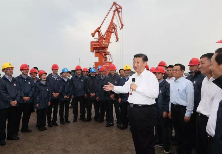 ↑2017年4月19日下午,中共中央總書記、國家主席、中央軍委主席習近平在廣西北海市鐵山港公用碼頭親切看望在現場作業的工人們。新華社記者 鞠鵬 攝