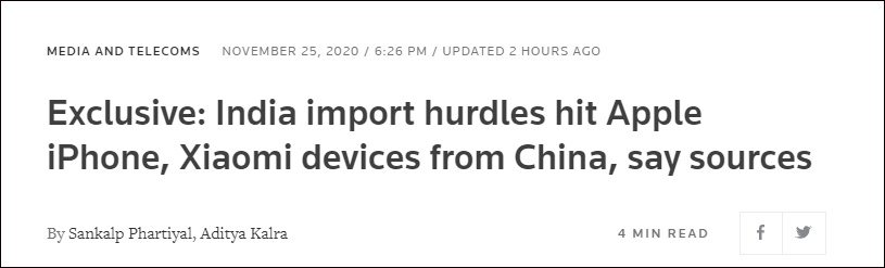 兩名知情人士告訴路透社,**印度政府此舉原是嚴格控制來自中國的電子產品,但卻影響了蘋果公司新型iPhone手機的進口,導致新發售的iPhone 12在上個月遭遇通關延誤。**目前,蘋果印度公司高管呼籲印度標準局加快審批速度,並保證公司將繼續擴大在印度的組裝業務。