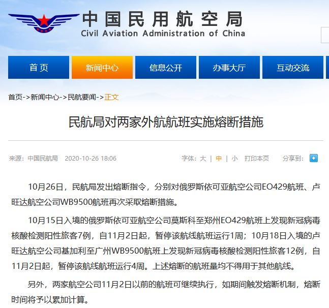 民航局官方網站上發佈的消息稱:“10月15日入境的俄羅斯依可亞航空公司莫斯科至鄭州EO429航班上發現新冠病毒核酸檢測陽性旅客7例,自11月2日起,暫停該航線航班運行1周。”