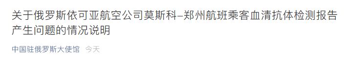微信公號“中國駐俄羅斯大使館”11月26日發佈《關於俄羅斯依可亞航空公司莫斯科-鄭州航班乘客血清抗體檢測報告產生問題的情況説明》。內容如下: