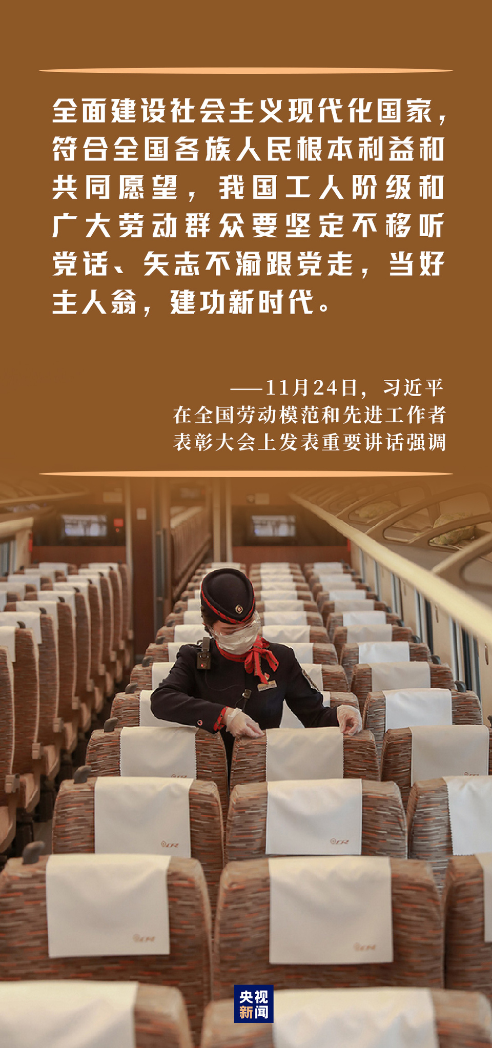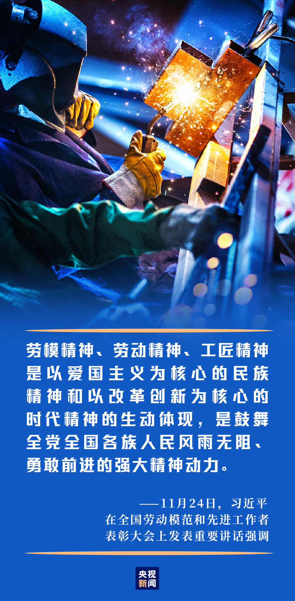 11月24日上午,習近平總書記在全國勞動模範和先進工作者表彰大會上發表重要講話,點贊勞動模範是民族的精英、人民的楷模,是共和國的功臣,讚揚工人階級和廣大勞動羣眾用智慧和汗水譜寫了“中國夢·勞動美”的新篇章,鼓舞全黨全國各族人民大力弘揚勞模精神、勞動精神、工匠精神,在全面建設社會主義現代化國家新徵程上創造新的時代輝煌。