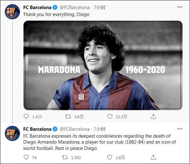 巴塞羅那在推特上寫道:“謝謝你所做的一切事,迭戈。”配圖中,是馬拉多納身穿巴薩紅藍戰袍的舊影。