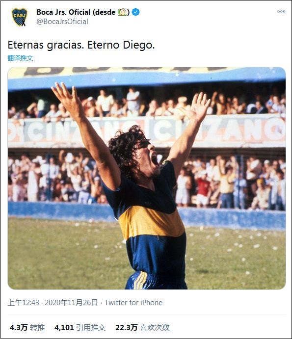 因此,當馬拉多納的悲訊傳來,博卡青年隊也第一時間送上悼念,在推特上寫道:“永遠的感謝,永遠的迭戈。”短時間之內,這條推文就收穫了22萬多個贊,上萬條評論加轉發。球迷們紛紛在這條推特下,用文字和圖片表達對這位球星的悼念。