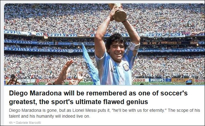 ESPN頭條將馬拉多納稱為“有缺陷的天才”