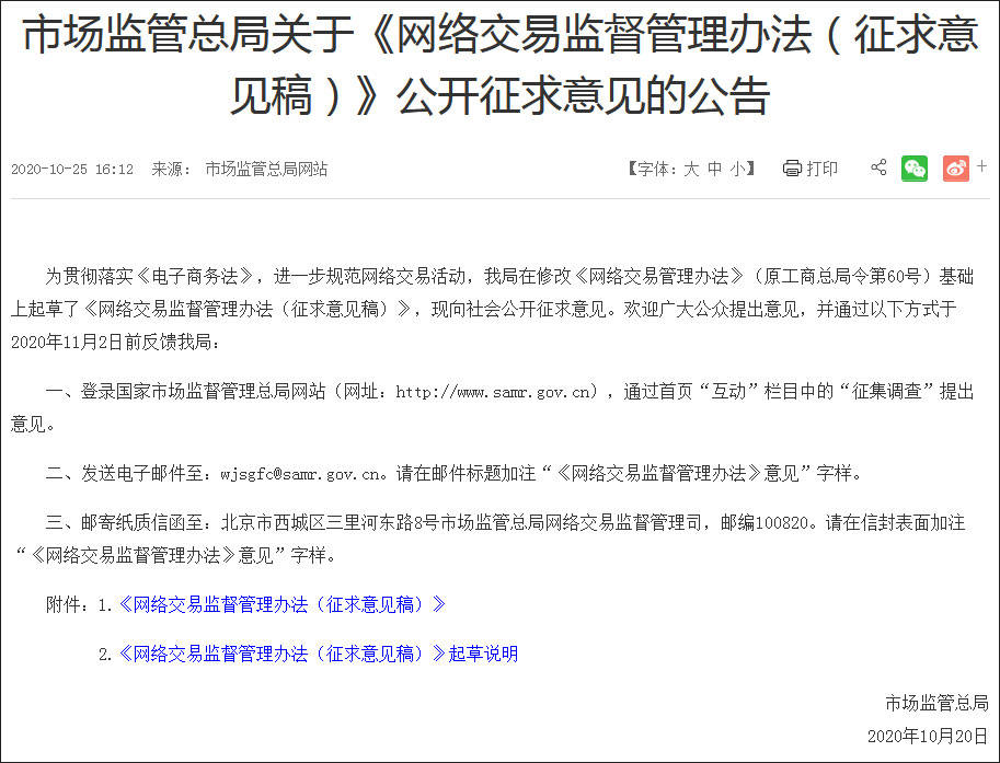 11月10日,國家市場監管總局發佈《關於平台經濟領域的反壟斷指南(徵求意見稿)》,其中提及“二選一”、“大數據殺熟”等近年輿論廣泛關注的現象,實施差別待遇,商譽詆譭、裹挾交易等違法違規競爭行為也被點名。