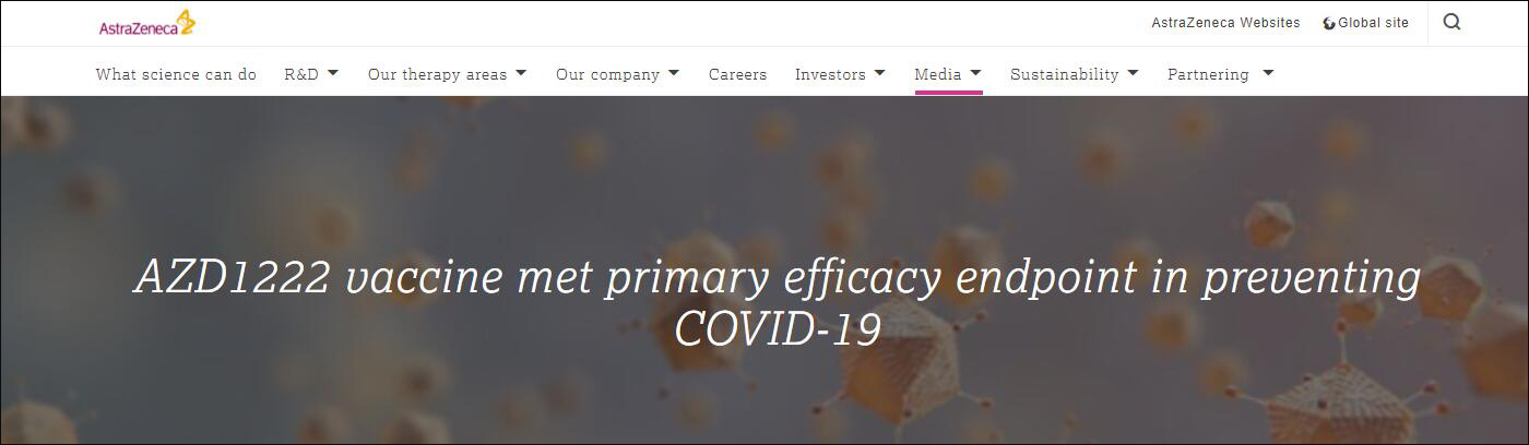 阿斯利康23日公佈疫苗有效性,自誇“非常有效” 截圖自官網