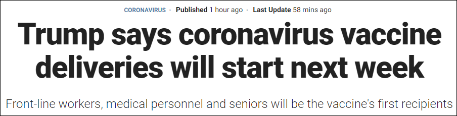 福克斯新聞:特朗普表示,新冠疫苗將於下週開始交付