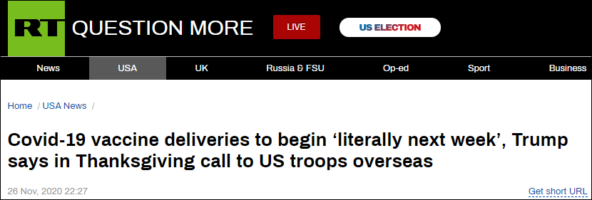 RT:感恩節期間,特朗普致電海外美軍,稱新冠疫苗將於下週開始交付