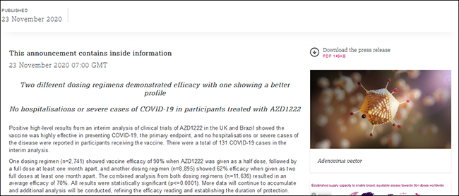 這一錯誤立刻引起了科學界的質疑。據路透社、彭博社等媒體11月26日報道,一些專家認為,試驗數據在一些關鍵方面缺乏透明度,一劑半劑量方案的樣本量相對兩劑方案又顯得過少,他們懷疑數據可能存在“重大漏洞”。