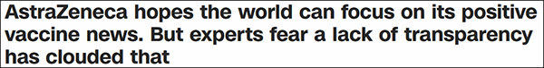 疫苗數據的低透明度也遭到了外界的質疑。在阿斯利康和牛津大學最早的聲明中,完全沒有提到一劑半方案的失誤以及這批志願者的年齡層次問題。在接受CNN採訪時,阿斯利康和牛津大學的工作人員竟然都説不清一劑半方案組受試者的年齡層次。