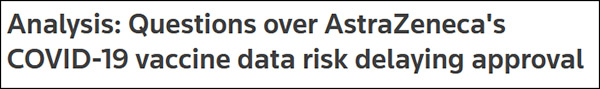 路透社指出,除了總體的有效率外,阿斯利康的報告幾乎沒提供什麼有價值的信息,報告甚至都沒給出兩組受試者及安慰劑對照組的具體感染人數。