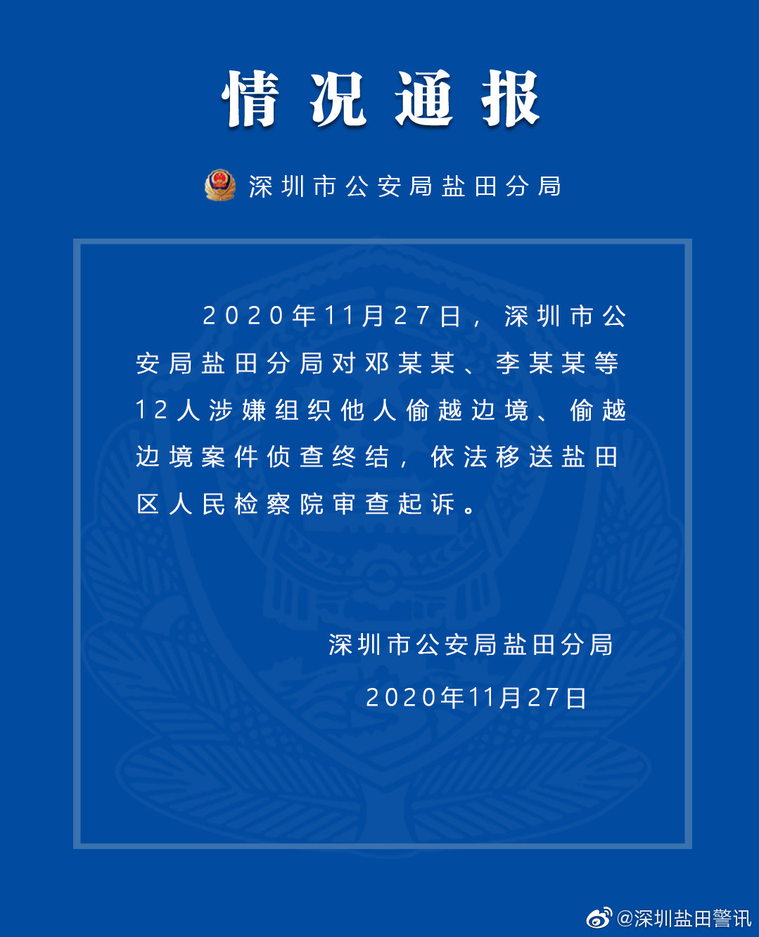 深圳市公安局鹽田分局@深圳鹽田警訊 11月27日消息:11月27日,深圳市公安局鹽田分局對鄧某某、李某某等12人涉嫌組織他人偷越邊境、偷越邊境案件偵查終結,依法移送鹽田區檢察院審查起訴。