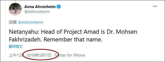2018年內塔尼亞胡點名法赫裏扎德時説,以色列從伊朗秘密核檔案中獲得了10萬份文件,他是據此得出的結論。