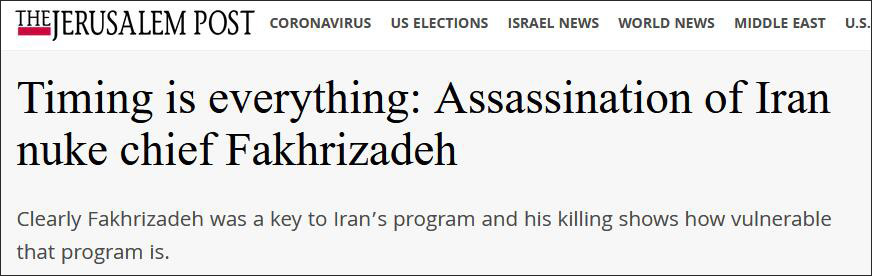 《耶路撒冷郵報》還在報道中特別提到了暗殺時間,稱“時間就是一切”,對法赫裏扎德的暗殺正值美國大選之後、新任總統上任之前,是個敏感而重要的時刻。