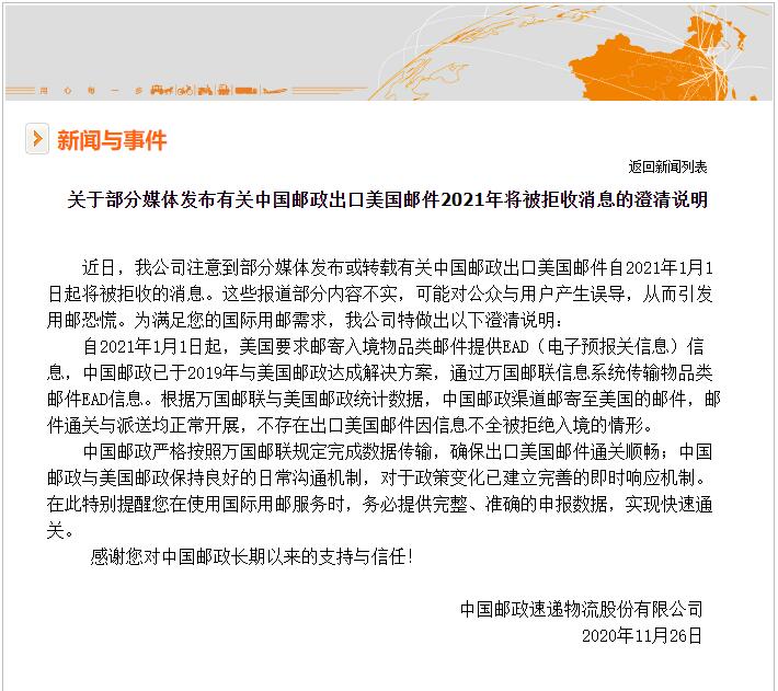 對此,中國郵政發佈澄清表示,數據顯示中國郵政渠道郵寄至美國的郵件,郵件通關與派送均正常開展,不存在出口美國郵件因信息不全被拒絕入境的情形。