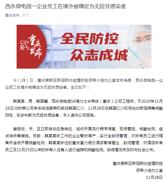 韓某某,男,韓國籍,西永微電園SK海力士半導體(重慶)公司工程師,於2020年11月26日20時乘公司專車經成都乘機前往韓國仁川,11月28日在韓國仁川機場檢出新冠病毒核酸陽性,初步判斷為無症狀感染者,本人遂向公司報告。