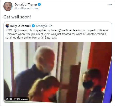 而儘管總統辯論期間沒給過對手好臉看、至今不肯承認輸掉大選,美國現任總統特朗普週日晚還是在推特上向拜登送去“慰問”:“儘快好起來!”