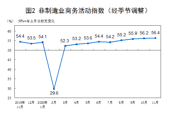 11月份,非製造業商務活動指數為56.4%,比上月上升0.2個百分點,為年內高點,非製造業延續穩中向好的恢復態勢。
