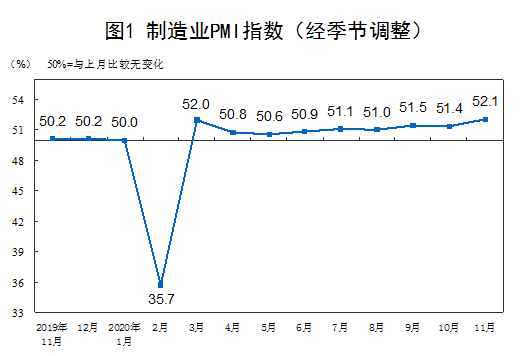 國家統計局:11月製造業PMI為52.1%,連續9月位於臨界點以上