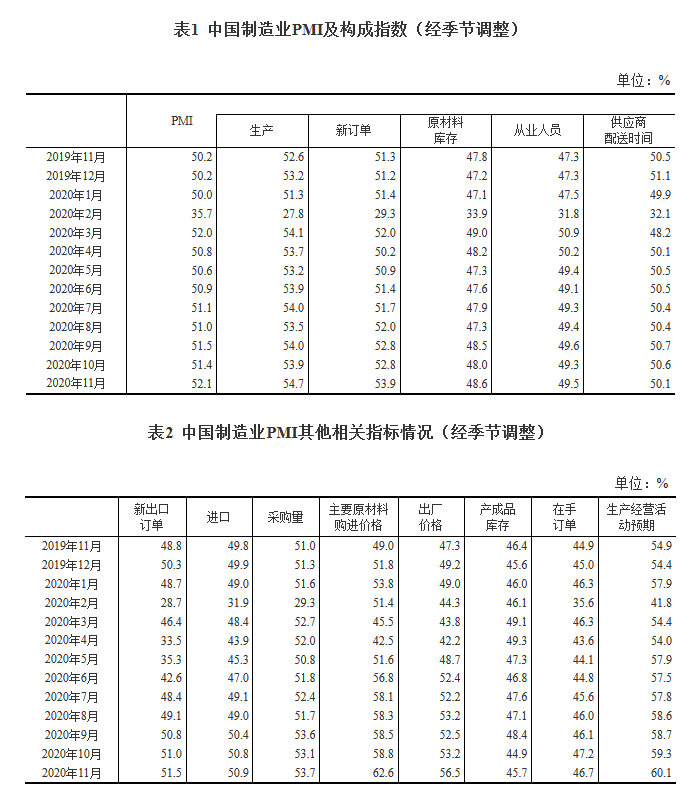 隨着統籌疫情防控和經濟社會發展取得顯著成效,我國經濟繼續穩定恢復。11月份,中國製造業採購經理指數、非製造業商務活動指數和綜合PMI產出指數分別為52.1%、56.4%和55.7%,高於上月0.7、0.2和0.4個百分點,三大指數均位於年內高點,連續9個月高於臨界點。