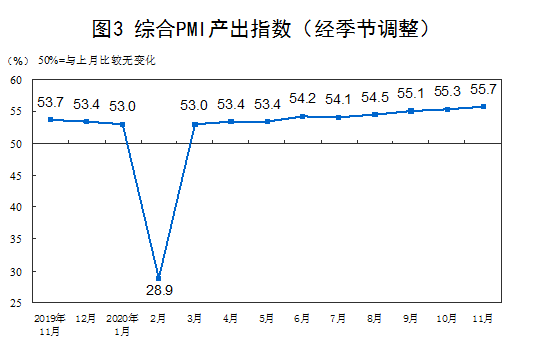 11月份,綜合PMI產出指數為55.7%,比上月上升0.4個百分點,表明我國企業生產經營活動持續加快。