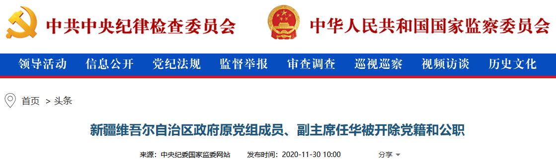 11月30日,中央紀委國家監委網站發佈通報稱,日前,經中共中央批准,中央紀委國家監委對新疆維吾爾自治區政府原黨組成員、副主席任華嚴重違紀違法問題進行了立案審查調查。