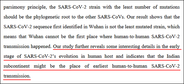 該團隊在統計分析了17個國家及地區的病毒序列及毒株後發現,印度和孟加拉國的毒株多樣性最高。論文指出,印度次大陸可能是最早發生人際間傳播的地區。結合新冠病毒的突變率,研究小組認為最早的新冠病毒人際間傳播可能要追溯到2019年7月或8月。