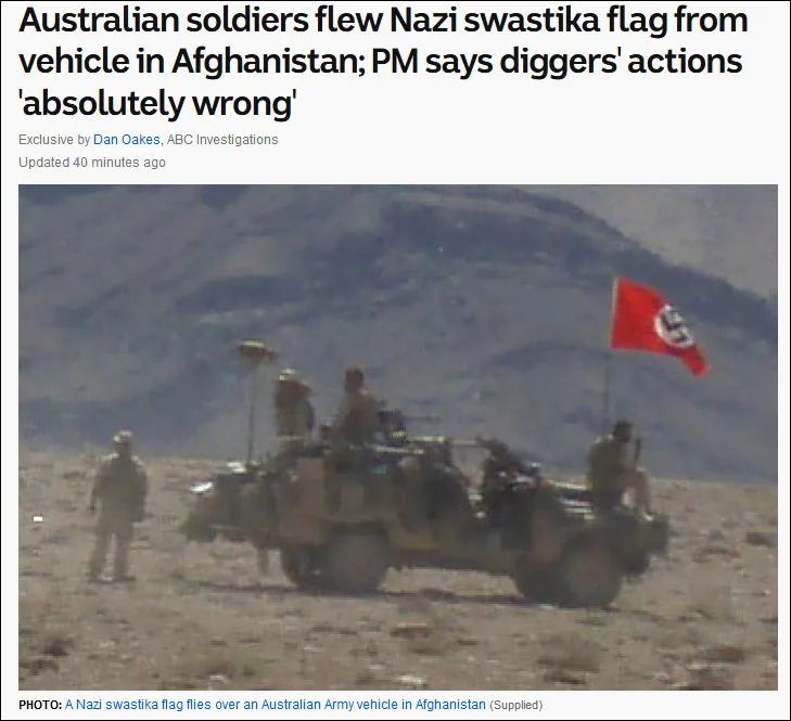 2007年8月,澳大利亞士兵在阿富汗執行任務時,被拍到軍車上高掛納粹德國的旗幟。