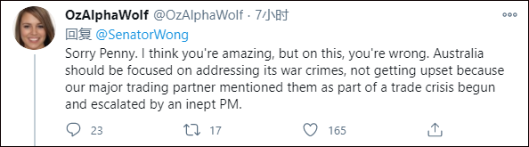“我覺得你很了不起,但在這一點上,你錯了。澳大利亞應該專注於解決其戰爭罪行,而不是因為我們的主要貿易伙伴提到他們而感到不安。而這一切屬於我們無能的首相開始並升級的貿易危機的一部分。”