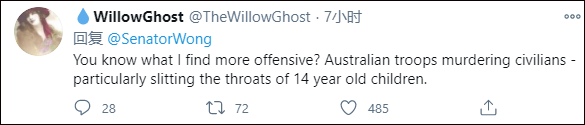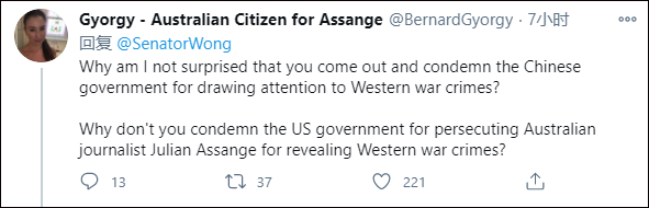 “當中國政府引起人們對西方戰爭罪行的關注時,你站出來譴責。為什麼我對此一點也不感到驚訝?你為什麼不譴責美國政府迫害澳大利亞記者阿桑奇揭露西方戰爭罪行?”