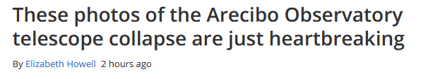 今年8月和11月,阿雷西博射電望遠鏡分別發生了兩次支撐鋼索鬆脱斷裂並砸毀鏡面的事故。美國國家科學基金會經評估後,於11月19日宣佈,將正式安排阿雷西博射電望遠鏡“退役”,並對其進行拆除。