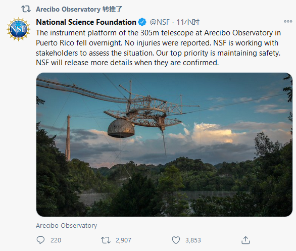 另據美國國家科學基金會(NSF)發佈推文介紹,望遠鏡的電子接收器墜落後,沒有人員傷亡報告。目前,該基金會正在與利益相關方合作評估情況。“我們的首要任務是維護安全。確認後,NSF將發佈更多詳細信息。”