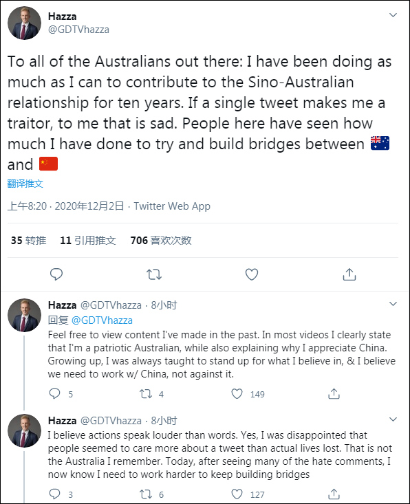 而Hazza此前在趙立堅推特下的留言原文是:“尊敬的趙立堅,今天(我)作為澳大利亞人感到非常慚愧。非常抱歉。這十年來一直在努力促進中澳關係。今天是我第一次真正考慮放棄澳洲的國籍了。我十年前離開的澳洲和今天的澳洲完全不一樣了。我都不想回去了。我為您致敬,為您付出的一切致敬。希望我國領導能夠向您學習,這樣世界才能和平繁榮富有。對不起。”