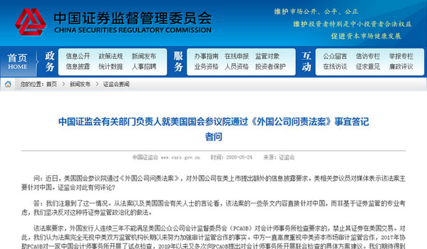 早在今年5月參議院通過《外國公司問責法案》時,證監會就表示:“一些條文內容直接針對中國,而非基於證券監管的專業考慮,我們堅決反對這種將證券監管政治化的做法。該法案對雙方利益都會造成損害,不僅會阻礙外國企業赴美上市,更將削弱全球投資者對美國資本市場的信心及其國際地位。”