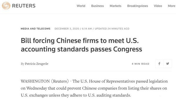 當地時間12月2日,美國眾議院通過了《外國公司問責法案》,要求外國公司連續三年不能滿足美國公眾公司會計監督委員會(PCAOB)對會計師事務所檢查要求的,禁止其證券在美國交易。美國就這一針對中國和中國企業的措施醖釀已久,參議院也在今年5月以全體無異議表決的方式通過了這一法案。也就是説,接下來只需要特朗普籤個字,法案即會生效。